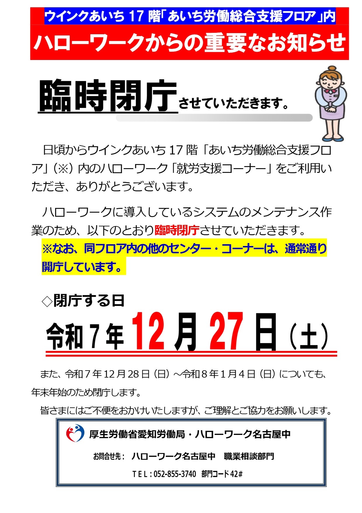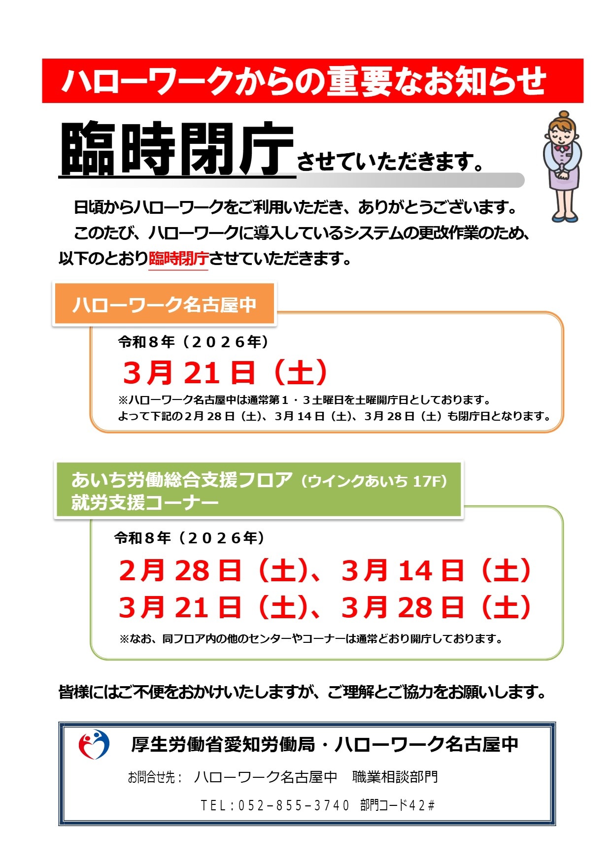 - A ハローワーク名古屋中で公開している求人情報と同じです。