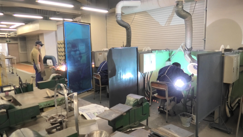 製造業や建設業で求められる金属加工(切る・接合する・曲げる)全般を6か月で学ぶ訓練科です。図面の読み書き、板金作業(手工具を使った作業から工作機械操作まで)、ガス溶接やアーク溶接など、指導員のもとで基礎から学び、就職先で活躍するための基本となる技能習得を目指しています。