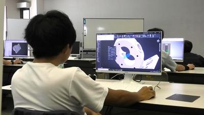 そこで、実習に取り組んでいる訓練生の様子を見学。訓練生は3次元CADを使って歯車ポンプの3Dモデリング(立体的な構造物を作成する作業)を行っていました。作業は図面を元に、画面上で一つひとつのパーツを立体化していきます。訓練生は時々、画面上の立体物を回転させながら、様々な角度から形状をチェック。