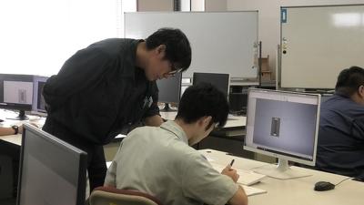 指導員の岩崎 春樹さんによると、訓練生からの質問で一番多いのは、エラーの原因についてだそうです。エラーは、寸法値の誤りや条件設定の不備により形状が成立しない場合など、さまざまな原因で発生します。訓練生は、その原因を仲間同士で話し合ったり、指導員にアドバイスを求めたりしながら、原因を探っていきます。様々な失敗経験から何かを学び取ろうという意欲が伝わってくる訓練の様子でした。