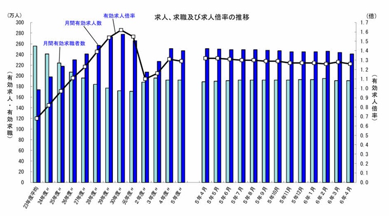 厚生労働省が公表しているデータを見ると月間の有効求職者数が約194万人、企業が出す有効求人数が約251万人となっており有効求人数から有効求職者数を割った有効求人倍率は1.3となります(季節調整値では1.28倍です)。