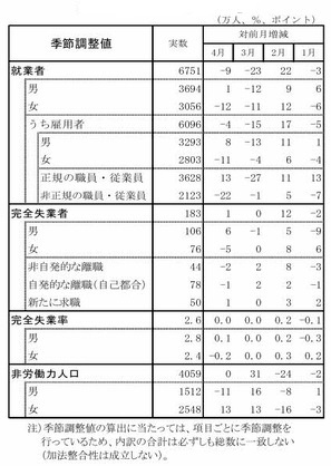 まずは日本の労働市場のデータを観察してみましょう。現在働いている就業者の数は男女計で6760万人、働く意思はあるが現在職探しなどで失業中の人は182万人います。日本国内で働く意思のある人の合計である労働力人口はその合計である6942万人ということになります。働く意思があるのに仕事に就けていない人の割合である完全失業率は182/6942を計算して約2.6%ということになります。