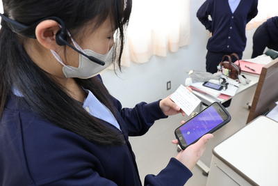 着脱を終えた後は、介護の記録を音声入力することでPC入力の手間を省き、業務を効率化するためのアプリ「ハナスト」を使用。インカムを付けた生徒が、利用者の様子や業務内容などを話し、スマホ端末に記録を行っていました。なかには音声が認識されず利用者の名前が誤って記録されるなど、スムーズに記録ができない生徒もいましたが、先生の指導の下、音声入力する際の話し方のコツを徐々につかみ、授業が終わる頃には音声入力アプリの操作にもだいぶ慣れた様子でした。