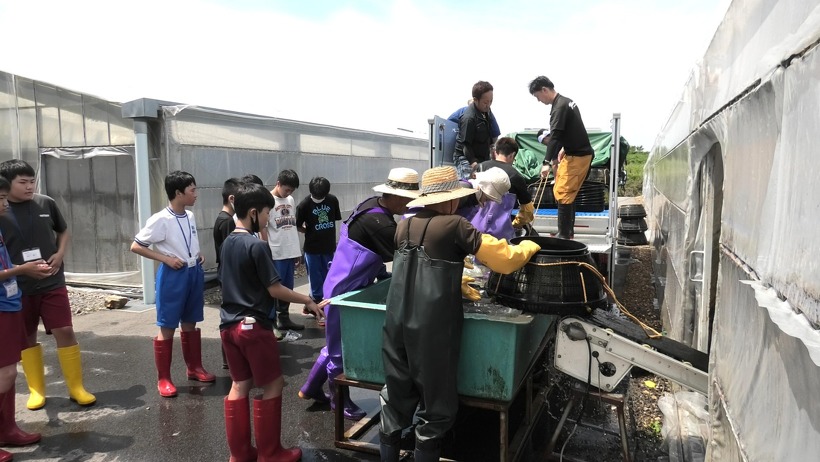 職場体験は仕入れ現場からスタート。5人の生徒はうなぎを養殖している池に向かい、トラックに積み込む作業を見学しました。うなぎの入っているカゴ(どうまん)は一杯約40kg。今回は60杯をトラックに積み込みます。最盛期には、この何倍も仕入れると聞き、みんな驚いていました。
