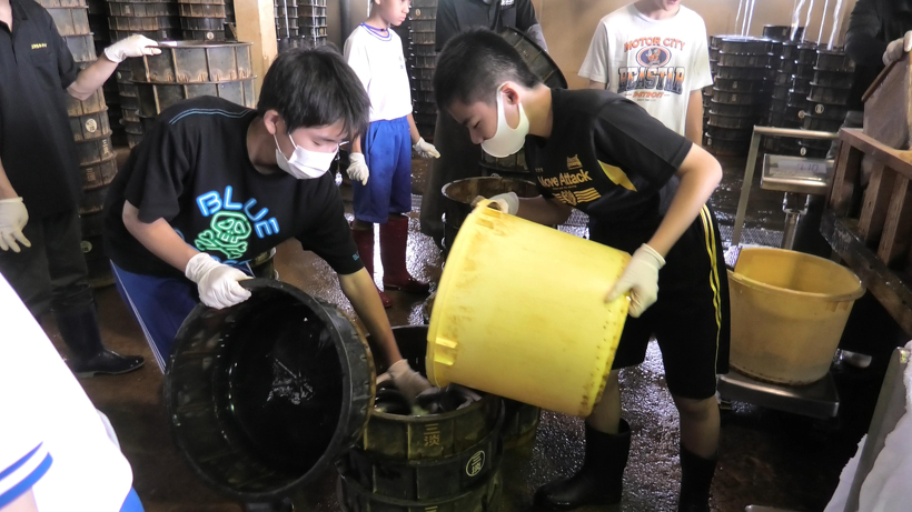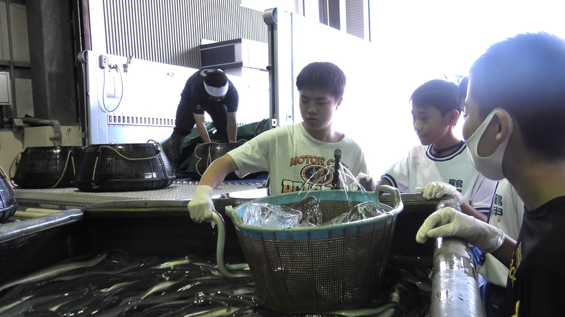 会社に戻り、カゴから選別するための台に、うなぎを移す作業を生徒たちが体験。二人一組になってカゴを持ち上げ、最後はうなぎが残っていないか確認していきます。次は選別されたうなぎをザルに入れます。この時、逃げるうなぎがいるため、生徒たちはヌルヌルするうなぎと格闘。「体験前にユーチューブでうなぎのつかみ方を調べてきましたが、つかまえるのは難しかったです」と話す生徒もいました。