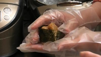 ご飯の量やのりの巻き方などを教えあいながら天むすを握る生徒たち