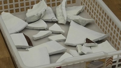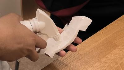 土器に見立てたすり鉢の破片に和紙を貼り付けます。模様をくっきりと浮かび上がらせるには、すり鉢と和紙を密着させるのがポイントということで、和紙に霧吹きで水を吹きかけ、空気を抜いて和紙をテープで固定していきます。