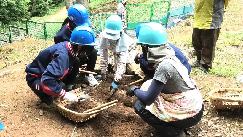 生徒たちは、30人ほどの作業員とともに発掘調査にあたりました。