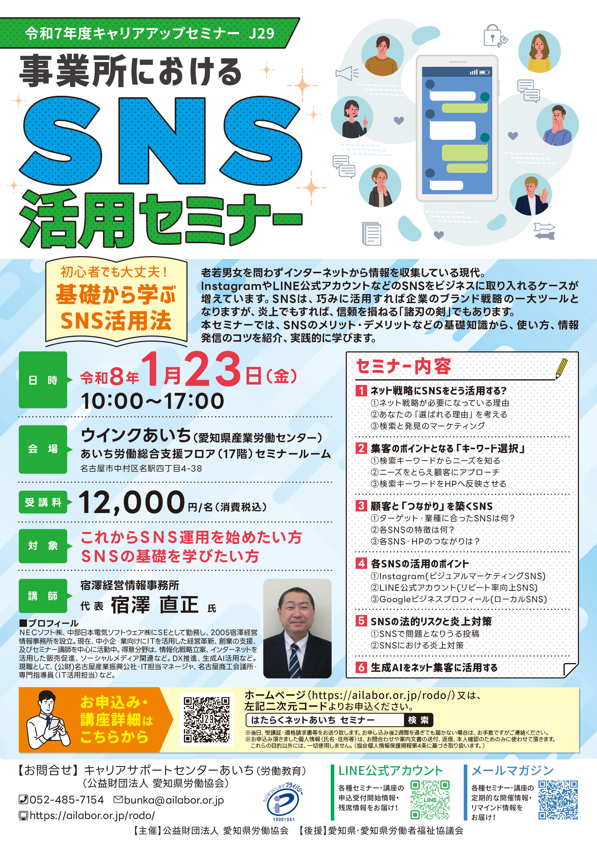 老若男女を問わずインターネットから情報収集している現代。InstagramやLINE公式アカウントなどのSNSをビジネスに取り入れるケースが増えています。SNSは、巧みに活用すれば企業のブランド戦略の一大ツールとなりますが、炎上でもすれば、信頼を損ねる「諸刃の剣」でもあります。本セミナーでは、SNSのメリット・デメリットなどの基礎知識から、使い方、情報発信のコツを紹介、実践的に学びます。