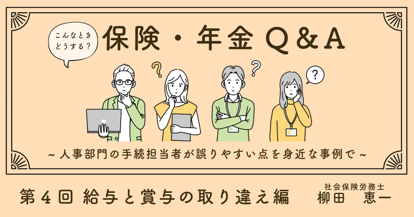保険・年金Q&A第4回は、社会保険の手続でありがちな給与と賞与の取り違えについて、その原因・対処法・防止法を解説してまいります。