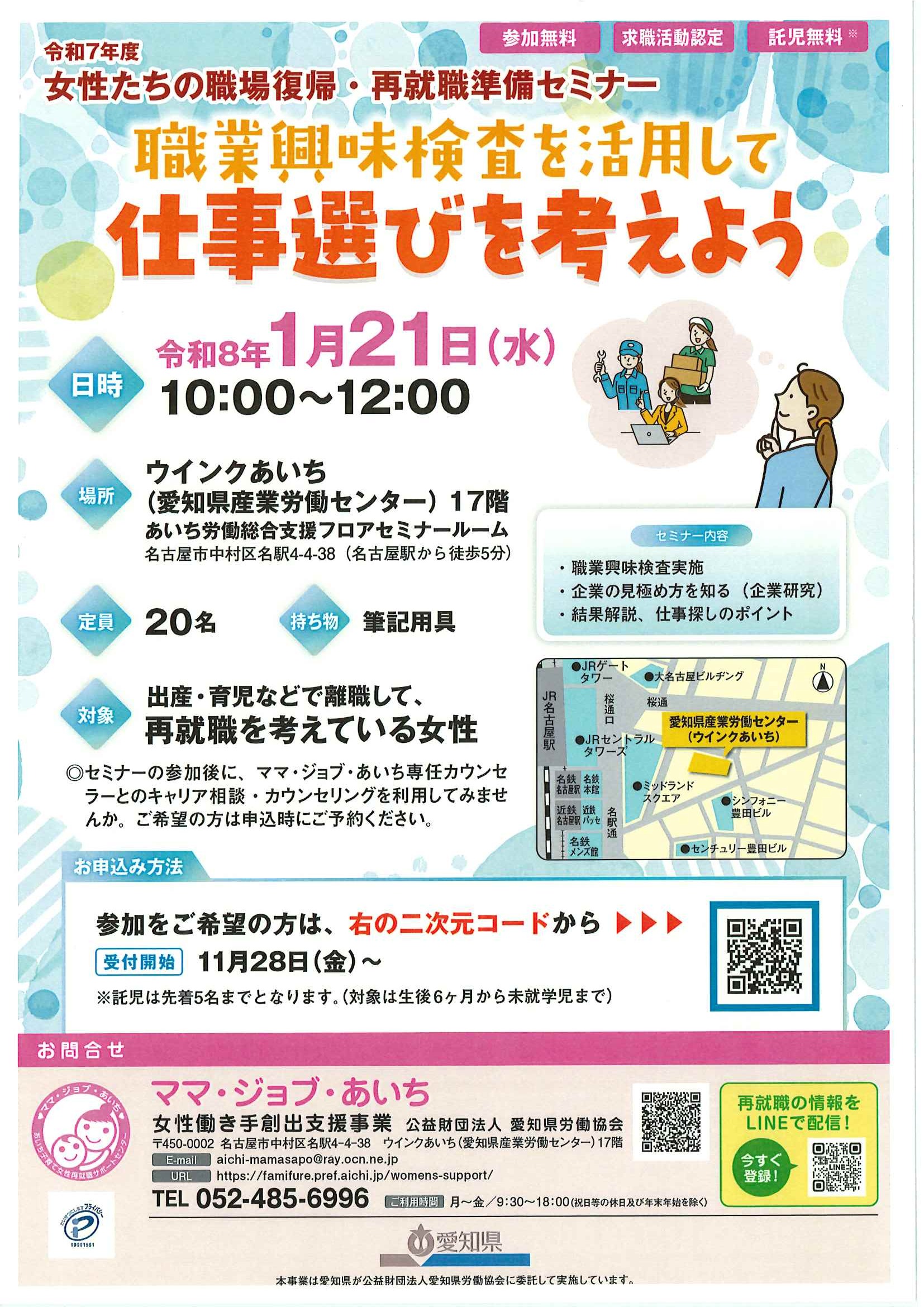 出産・育児などで離職した女性の方に、セミナーや職場見学、就職説明会などを通じて再就職をサポート